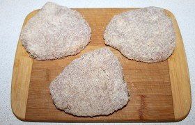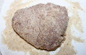 Break an egg, mix it with cream (milk, water) and whip mixture by a fork, or in other words, make an ordinary liaison for pickling. Immerse your round steaks in this liaison and allow them to stand for a half hour.