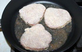 Keep the frying pan with vegetable oil (poured to 6-8 mm above the pan bottom) on the fire so that the oil has been overheated, and bread the meat with rusks.