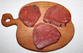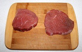 The standard weight of ordinary round steak is 115 g. This piece of beef (or steak, as it is named in a butcher's shop) must be cut exactly across fibers on 3 chunks about 22-25 mm thick each.