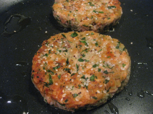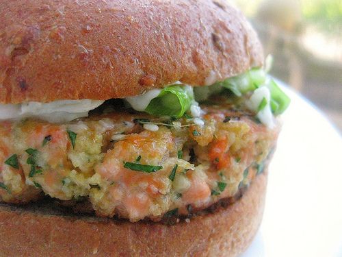 Lovers of fish dishes are sure to like this burger. Incredibly tender, juicy taste of a fish patty is accentuated by crispy sesame seeds. White sauce with greens is a perfect addition to the fish burger. It’s an appetizing dish, it is simply impossible to resist and not to try a piece of it. Salmon burgers can be served for dinner, as they are not only very delicious, but also substantial.