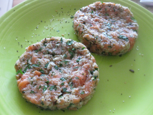 Form two patties from the mixture. Put a frying pan over medium heat and pour little oil. Once the oil is hot, put the patties on the pan. Fry approximately 3-4 minutes on one side, then turn with the spatula on the other side and fry another 3-4 minutes.