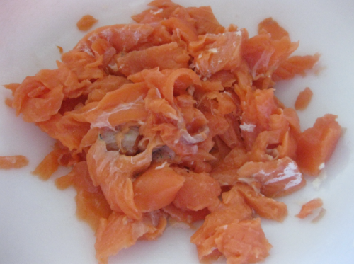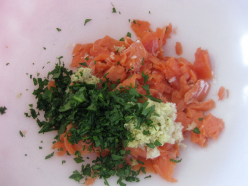 To begin with, we need to prepare all the ingredients. Unpack the salmon fillet. Remove the skin and small bones. Then put the fillet on a cutting board and cut into pieces about 0.5cm (0.2’) and up to 2.5 (1’) in length. After you have cut the fish, put it into a bowl and proceed to parsley. Shredded ingredients Wash the parsley under running water, then shake it over the sink a few times removing the excess water. Put it on a cutting board and shred. Then put the shredded parsley into the bowl with fish. Peel the garlic cloves.