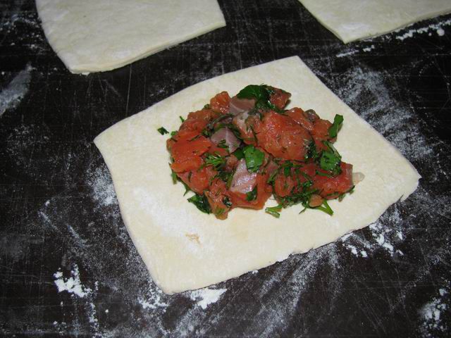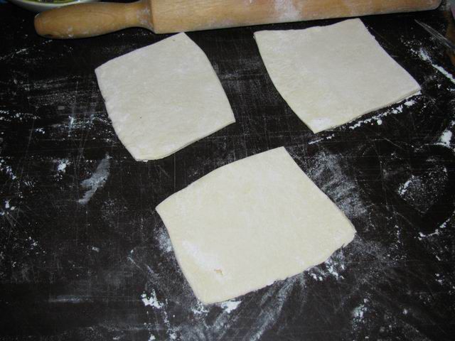 3. Cut the defrosted puff pastry into small squares and gently roll them out. The dough should not be too thin in order to make cakes more airy.