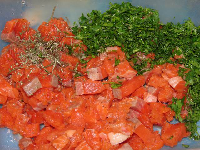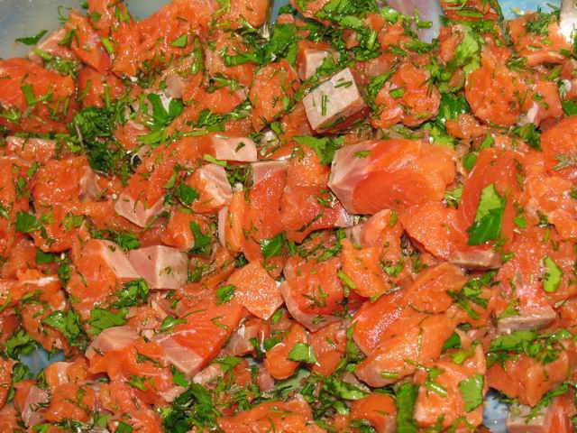 1. Wash and slightly dry the red fish and cut it into small cubes. You can use trout or salmon or Atlantic salmon, for example.