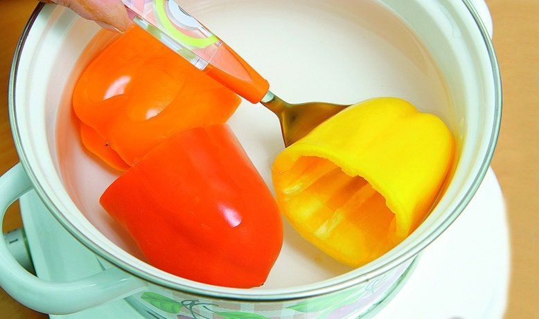 The water in a suitable deep saucepan bring to a boil and drop the peeled peppers in it for 2 minutes. Then put the hot peppers in a colander.