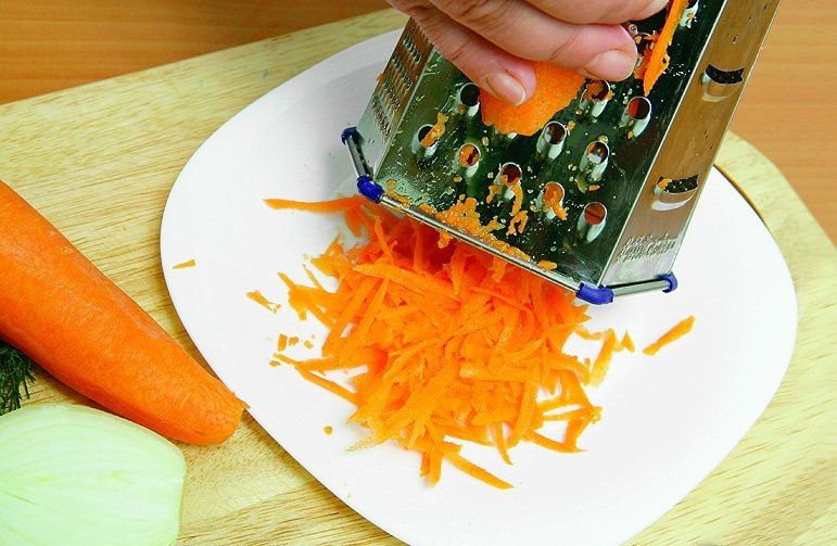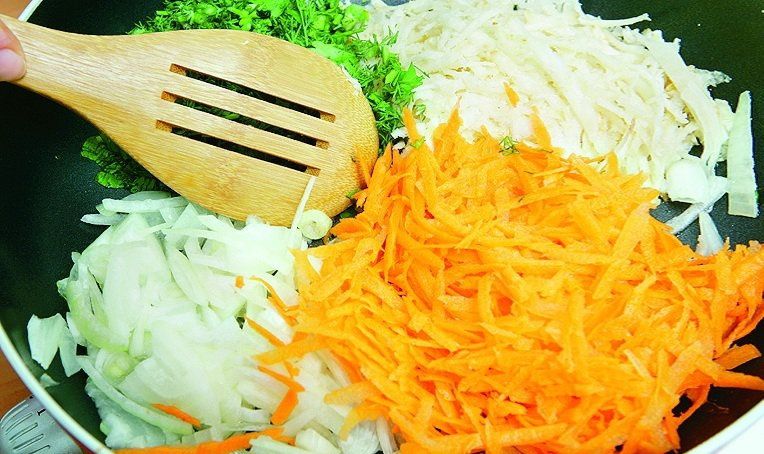 We peel the onions and cut into thin half-rings. Preheat a frying pan with a small amount of oil and fry the onion and carrots in it. Then we wash and clean the root of parsley and celery, cut it into small cubes and at first fry in a separate pan. Thereafter, we mix vegetables and shredded roots, add salt and pepper to the ingredients to taste.