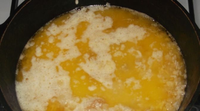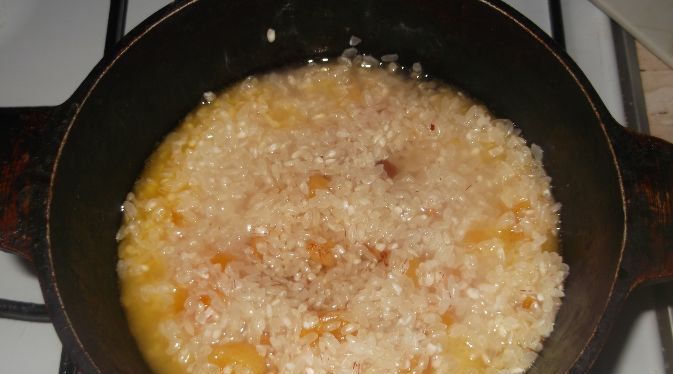 Melt 150 g of butter in a large pot. Put there dried apricots and raisins (a quarter of the total amount).
