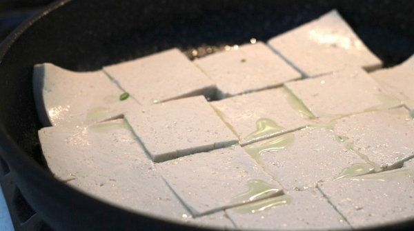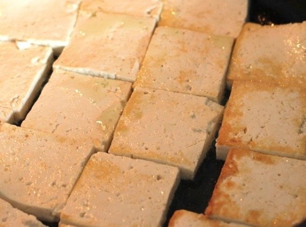 5. Roast the tofu for 2 minutes from both sides until the pieces are corn-colored at the medium fire.