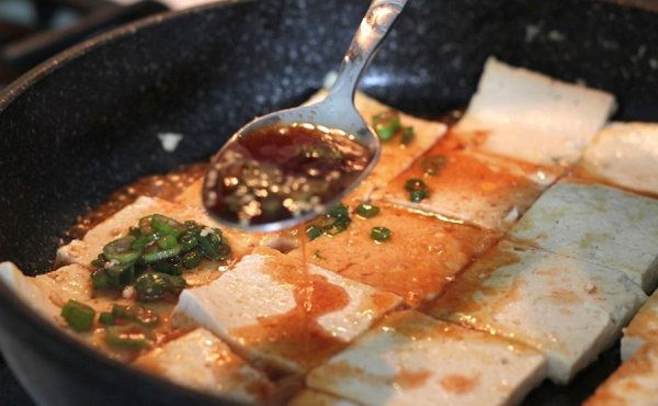 4. Hot up a big frying pan with some oil in it. Put the tofu slices in the pan.
