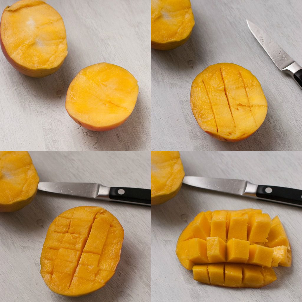 Cut mango in three parts. You should end up with three pieces: two halves, and a middle section that includes the pit.