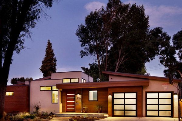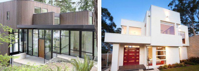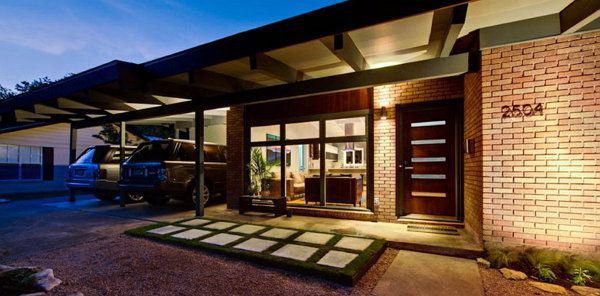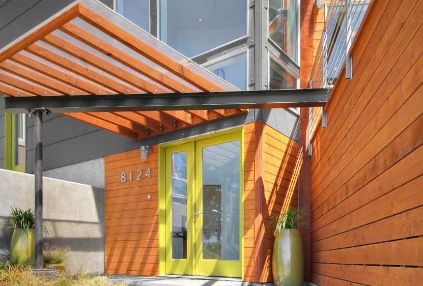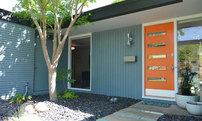 In case when the entrance of the house is decorated quite lowly (there aren’t too much decorations and everything is of the same colour), an unusual design of the entrance door will add variety into the exterior. The doors of contrasting colours that have a unique configuration is a bright spot on the background of the monochromic porch.