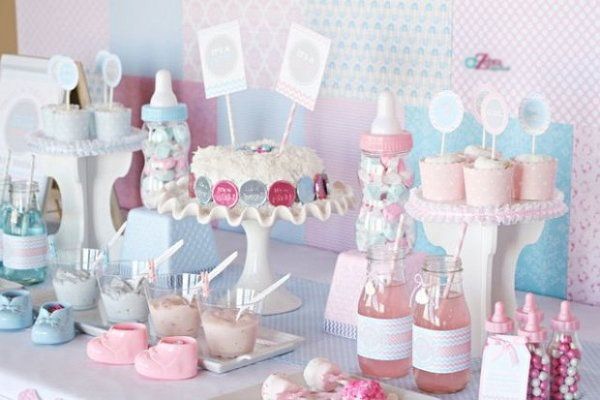 Put the table with treats in the center. Remember that in the classical version the Baby Shower party is held in the format of buffet table with a variety of sweets. We will devote a separate article to the candy bar where we will tell you what to serve at the Baby Shower. Now we are talking exclusively about decorations. You can serve drinks in baby bottles or jars from baby food. Toppings can be also put in the bottles, but it is worth to make bigger holes in the dummies. Do not forget about flags, paper caps and toppers for cupcakes and other sweets. You can insert napkins in baby teethers, rattles or put them into a baby cup.