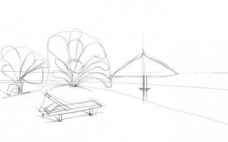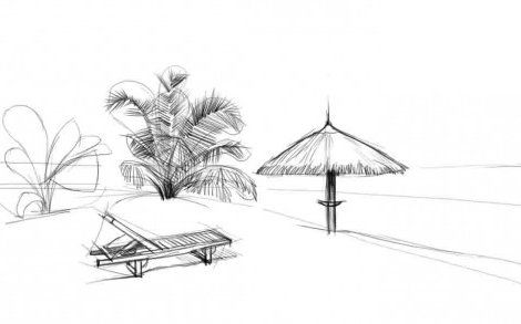 The first step. Making a sketch. First of all, we need to mark the location of the objects on a sheet of paper. You are free to depict whatever you want. As for us, we marked the location of a deck chair, sunshade and either several palm trees or other various exotic plants.