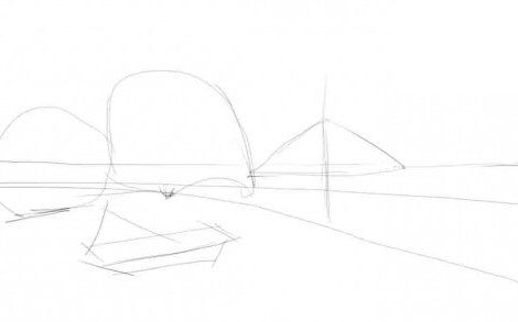 The fourth step. We add sea and clouds on the background. We make hatching on the foreground. The sketch is ready. This is what we have: