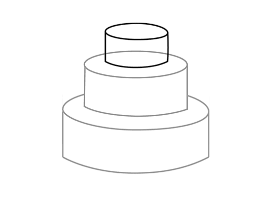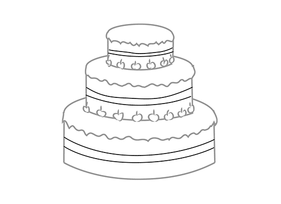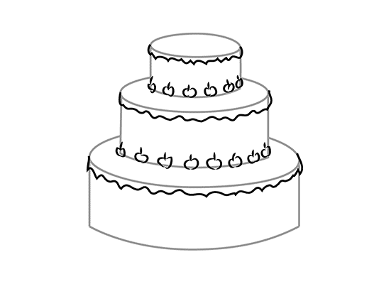 Erase unnecessary lines and draw cherries at the bottom of the top and the second layers, then in curved lines draw cream on the front side of your cake.