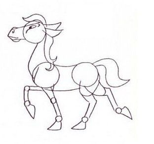 4. Draw beautiful, lush mane and silk fringe. Draw them in few smooth lines. Draw a circle and a curve to create the horse’s nose and mouth. Draw the joints. These are small circles on the legs, which will be hidden with smooth lines.