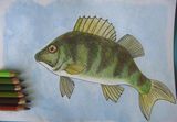 10. Wait until the drawing dries. Then shade the bass's body with different tints of a green color. Draw stripes on its body with a dark- brown pencil. Tint lightly the eyes of the fish with red-brown color;