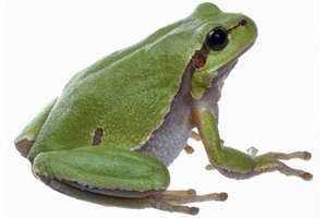 2. Now draw the frog's legs. The forearm of the forelimb should be more thickened. The hind feet should be drown as normal ovals. Add the arcs over the eyes. Draw the eyes and mouth. Draw fingers on the paws. The frog has a pattern coloring, so try to draw the curved lines along the body of the frog, which extend to the head and pass through the eye to the nose.