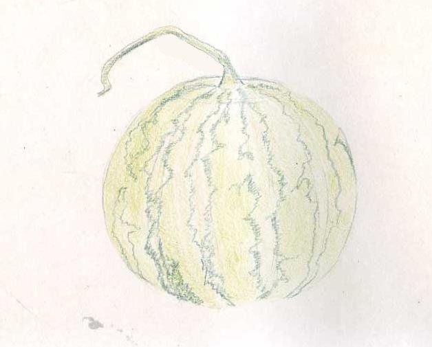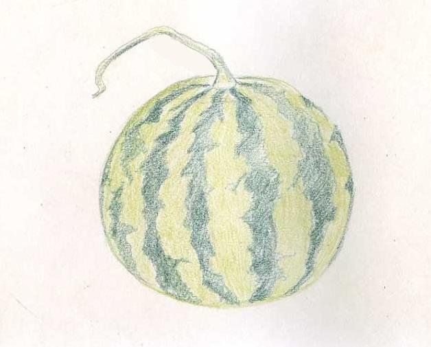 Shall we draw a watermelon with colored pencils? Why not! First we have to choose the correct pencil palette – a few green ones (in warmer and colder colors), yellow and brown ones. Each picture’s palette is always limited by a certain set of colors.