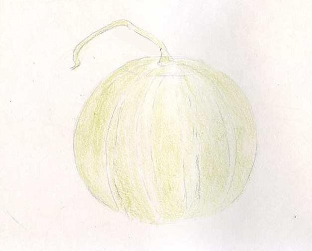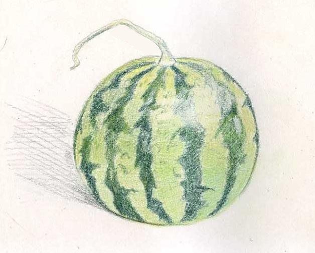 6. We continue coloring our watermelon in different shades of green (we use warmer ones for the top and colder ones for the bottom), leaving a light place for the patch of the reflected light.