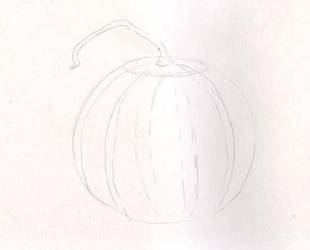 8. In the end we color a tail, adding a brownish grey shades. We distinguish the base of a tail on the left side with the help of a darker color. Then we add colder tones to lower part of the watermelon. And we add a drop shadow.