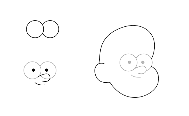 Draw the two eyes, first draw the first circle, then the second one to the right, but the second circle is not complete, it intersects with the first one. Next, exactly in the middle of each circle, draw small pupils, nose, mouth, and then the upper and lower part of the face, as well as the ear.