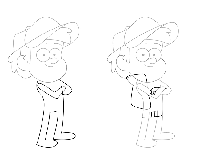 Erase the unnecessary lines, so it is similar to the picture, and continue to draw the second part of the vest, the t-shirt (its neck, bottom and sleeves), as well as socks and sneakers. You still need to draw a Christmas tree on the cap, and a Dipper from “Gravity Falls” is ready.
