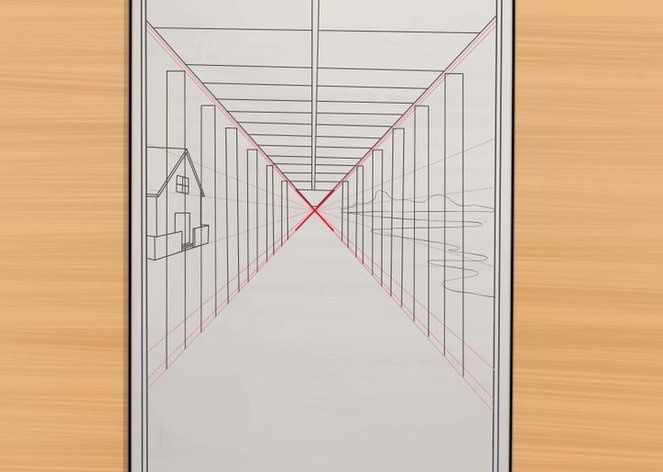 1. Start with marking a “disappearing” dot by drawing “X” in the center of the sheet. Then, draw the perspective lines starting from the center and to the edges of the sheet. Make sure that they can be used in your picture.