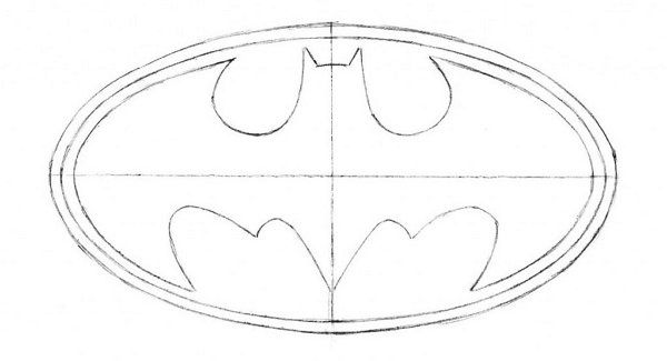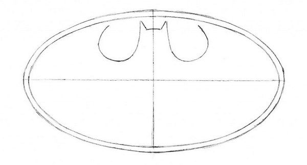 Step 4. From now on, it’ll be easier to draw Batman’s symbol. Inside the both of the ovals, we sketch the outline of the bat’s head and wings. If you orient yourself according to the lines drawn on the first stage, it won’t be hard to do.