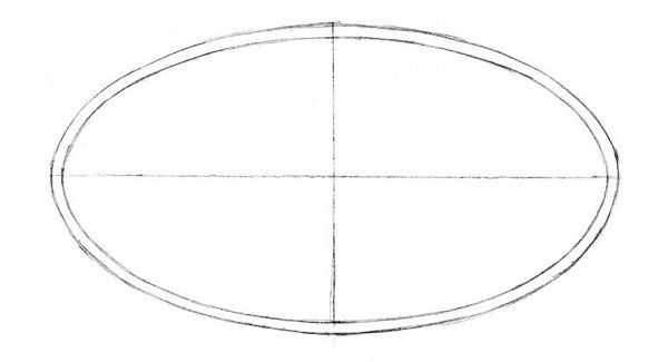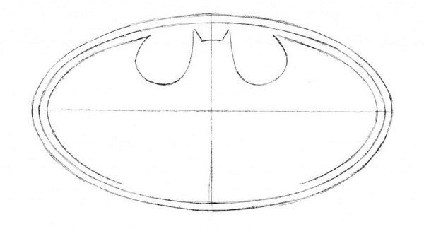 Step 2. Now, we draw over the lines under the oval. Press the pencil a bit. It’s likely that you’ll erase and draw again on this stage a lot since the frame of the Batman’s symbol should be ideally even. We also should mention here that we’ll draw only symmetrical lines on all the rest stages.