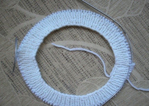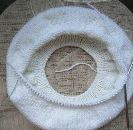 Within 10 cm from the knitting start, split the beret on 8 even parts (each part should contain 19 stitches).