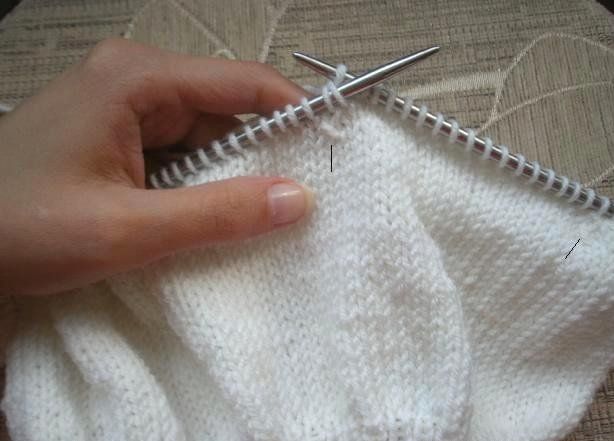 To do this, make 2 stitches after each 18 stitches instead of knit stitch back loop only. This stitch received after making two instead of the knit stitch back loop only will be the mark for your 8 parts. You can mark parts by pins. This stitch is marked on the photo by black lines. Make the next row in knit stitches too.