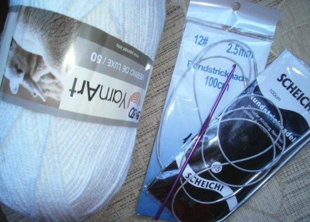 Knit everything circle-wise. Start with the rib. Make 128 stitches with the help of needles № 2,5 (64 stitches by each needle) and knit a rib 1x1 (1 knit stitch, 1 purl) in 8 rows (2 cm).
