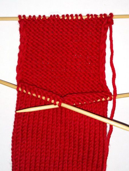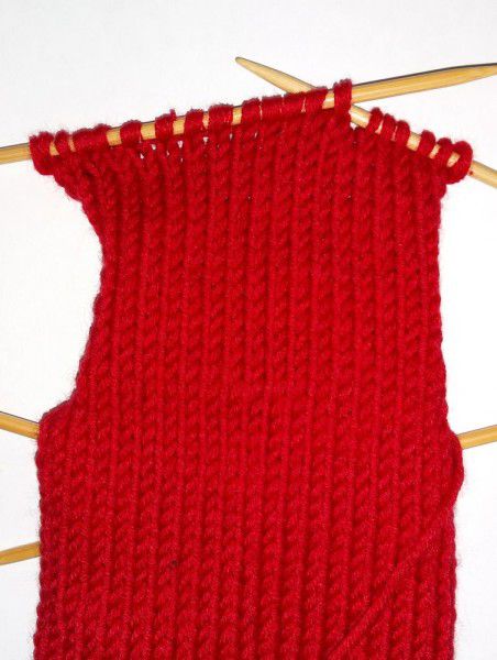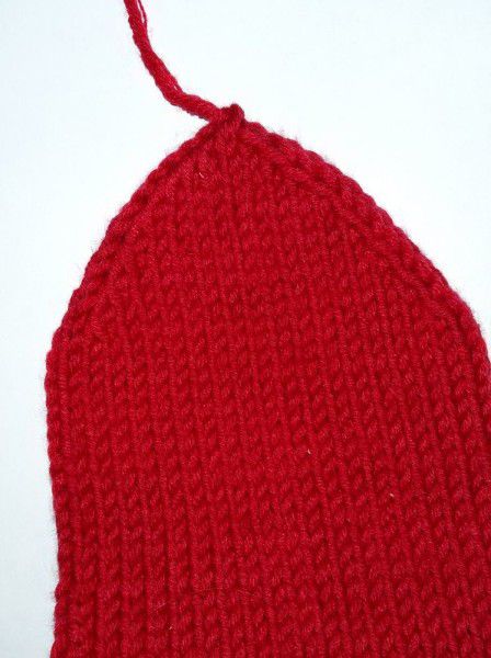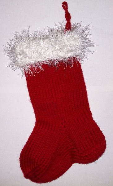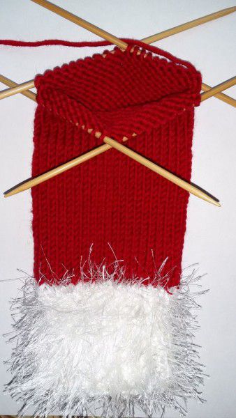 Rib a cuff 6 cm high (1x1). Then take the red yarn. Knit the stocking with the stockinette stitch. Make classic face loops to prevent the knitting go askew. Knit the bootleg 14 cm.