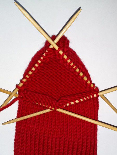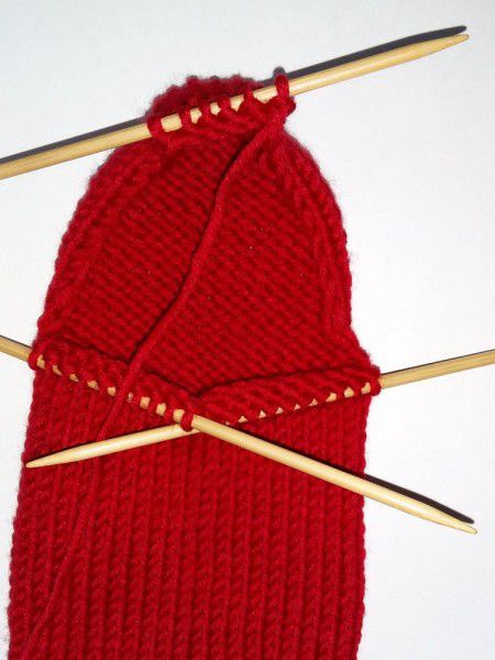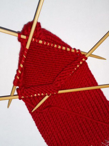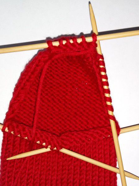 Get back to knitting with five needles. Knit the loops in the front of the stoking with the needle where the loops of the middle part were. Draw one loop from each selvage stitch, so you get 9 loops.