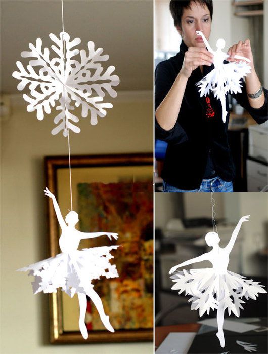 Such hanging decorations which designed for dangling from the ceiling can be made double, as well as threefold and and so forth. Their multiplicity depends on the size of ready-made snowflakes, on length of a thread and the room place where they would dangle. For example, you can make such garlands of small length so that they would not take up a lot of space. And it is possible to create a composition of snowflakes which would hang from a ceiling right to a floor.