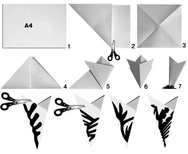 To cut out a snowflake, it is necessary to take an A4-sized sheet of paper. It must be folded in half diagonally. Cut off the excess strip of paper, thereby providing the equilateral square formation. This square needs in its turn to be folded several times diagonally so that the bend line could be accurately visible. The corner from which the snowflake will be cut out must be folded as it is shown in the picture. You can cut out any pattern which you have enough imagination to draw.