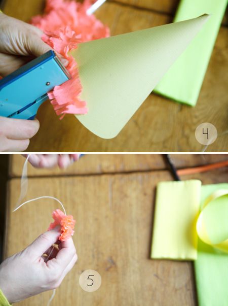 5. Decorate your birthday hat with application, round frill and pompons made of brown paper.