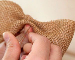 Make a few tight stitches in the center of the bow operating with a needle and a thread and make a nod on the reverse side. As burlap fabric is not very dense, the node at the end of your line can stretch out thoroughly, so you need to redouble your thread and tie its ends to make a wrap, which could then be "caught" when you have done the first loop.