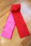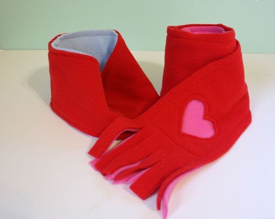 To make a scarf with hearts, sew two pieces of fleece of different colors, as shown on the photo. Stitch the short ends of the scarf far from the edge, so you can make the fringes (just cut slits on both pieces with scissors).
