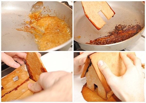 6. Prepare a container with thick bottom and fill it with sugar adding small amounts of water. The sugar should dissolve and the syrup becomes dense and yellowish. Dip the house parts into the syrup and glue them together. When you are done, put the house in the fridge for an hour.