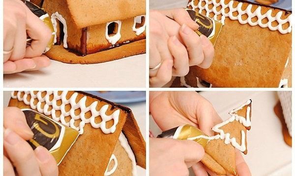 8. Use a pastry tube (or a home-made disposable syringe) to decorate the house. When you are done with decorations, again put the house in the fridge over night or for at least 7-9 hours.