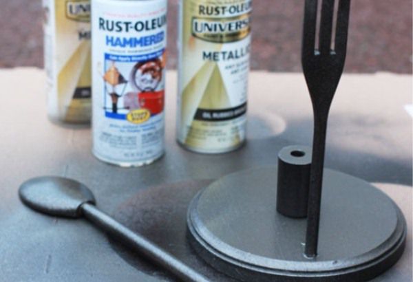 Step 1. Prepare the materials. Make sure the hole in the cylinder is slightly smaller than the spoon handle. Ideally, the spoon should be tightly secured in the cylinder. The fixation fork might need to be shortened. If you are using the old stuff, then don't forget to sand the wooden materials with sandpaper. Sanding will ensure a smooth finish and paint will stick better.