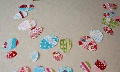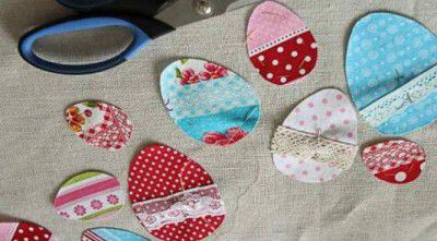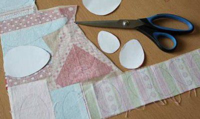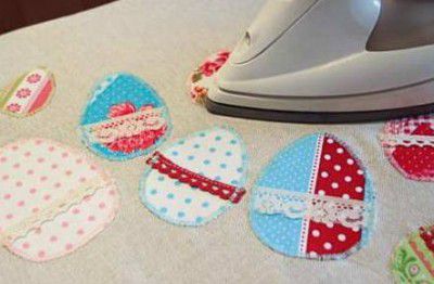 Now put aside the tablecloth and start making the decorated Easter eggs. Put the pieces of cotton fabric face up on the adhesive side of the interlining and iron.