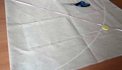 First, let's make the tablecloth. Fold the piece of linen four times and mark the circumference of the tablecloth with the help of the measuring tape and chalk.