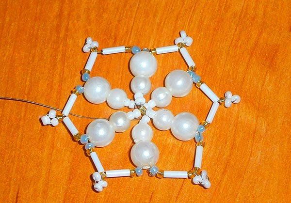 7. Then create 6 more the same parts of the snowflake. The very first small bead of gold color has to remain in the center of all structure.