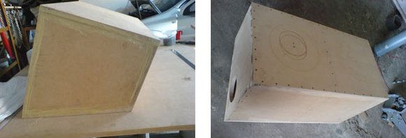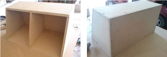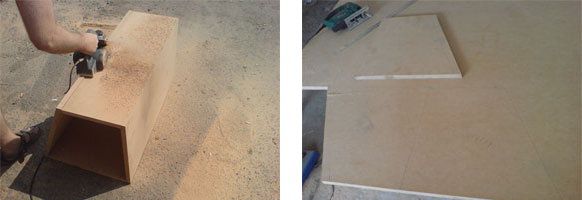 Remove the extra projecting parts with the plane. Is it ready? Take the box, set it on the side on a sheet of MDF and draw the future sidewall with a pencil from inside. Draw the other side too. As this subwoofer box is intended for two heads, the middle wall would not be out of place for it:
