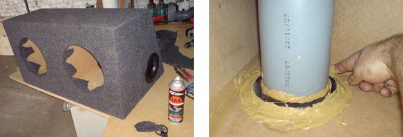 Glue the "wedges" of the carpet with a spray and fold them inside. And do not fear to dirty hands with "liquid nails" – they can be washed with the solvent 646. Anyway, the phase inverters must be glued inside to create the full hermetic state on connections: