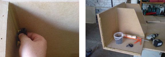 Insert the sidewalls and the middle wall (if you have a box for two subwoofers) and attach them. The foundation is ready; it is time to make holes for drywall screws in order to connect walls of the subwoofer box. If they do not enter into depth of material, ream spaces for blinding of heads with the drill, the diameter of which is 8 mm. The craftsman from the example did not have to do that, because everything peeped into with a swing: