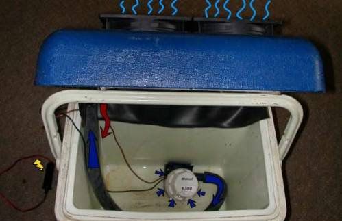 Fill the cooler bag with ice (you can use ice bricks as an option) and water. When you turn on the system, it will start pumping cold water from the cooler bag to the radiator, making the fans blow cool air out. You can make this system bigger for the needs of your space. It is suitable for inside use.